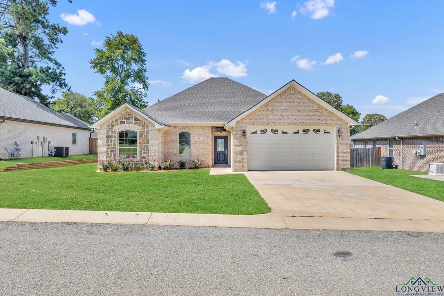 Welcome to Nolan Farms—a postcard-worthy community where East Texas charm meets modern comfort. This thoughtfully designed 3-bedroom, 2-bath brick and stone home offers stylish curb appeal and everyday functionality with a 2-car garage, front and back sprinklers, and a 6ft wood privacy fence with dual gates. Step inside to vaulted ceilings in the living room and third bedroom, custom cabinetry throughout, and upgraded finishes like granite countertops, vinyl plank flooring, and Roman arch doors. The primary suite features His & Hers closets, a garden tub, and a tiled walk-in shower with bench. Enjoy outdoor living with tongue-and-groove stained porches, an outdoor fan, and lighting for evening relaxation. Energy-efficient Low-E vinyl windows, upgraded lighting and plumbing packages, and Whirlpool stainless steel appliances add even more value. As a resident of Nolan Farms, you’ll love the beautifully landscaped entrance, future pavilion with restrooms, a stocked fishing pond, playground, and picnic space—perfect for family gatherings and community fun. Experience serene country living with modern perks in this inviting home