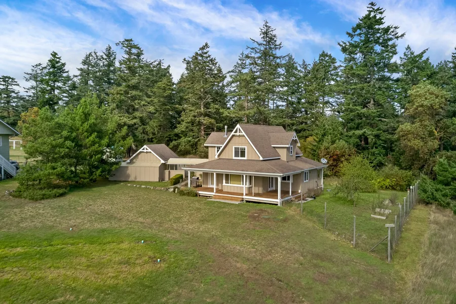 This classic Cape Cod style home is located in the quiet community of Portland Fair Estates. The 2-story 3 bedroom and 2 bathroom house sits on a 1.5 acre sunny and open lot with a fenced-in orchard and potential garden space. The kitchen offers ample storage space and has a breakfast bar, the open living and dining room area features a bay window, free standing propane stove and French doors leading to an expansive covered porch. The porch invites to relax and enjoy engaging scenic vistas over the southern end of San Juan Island to the Olympic Mountains beyond with peek-a-boo water views of Haro Strait. The master bedroom on the main level has its own bathroom, a walk-in closet and access to a small enclosed porch/sun room. The second story has two additional bedrooms and a bathroom with double sink vanity. The detached one car garage has a covered breezeway leading to the side entrance, which leads to a combined mud and laundry room. The home is equipped with high-speed fiber optic internet.