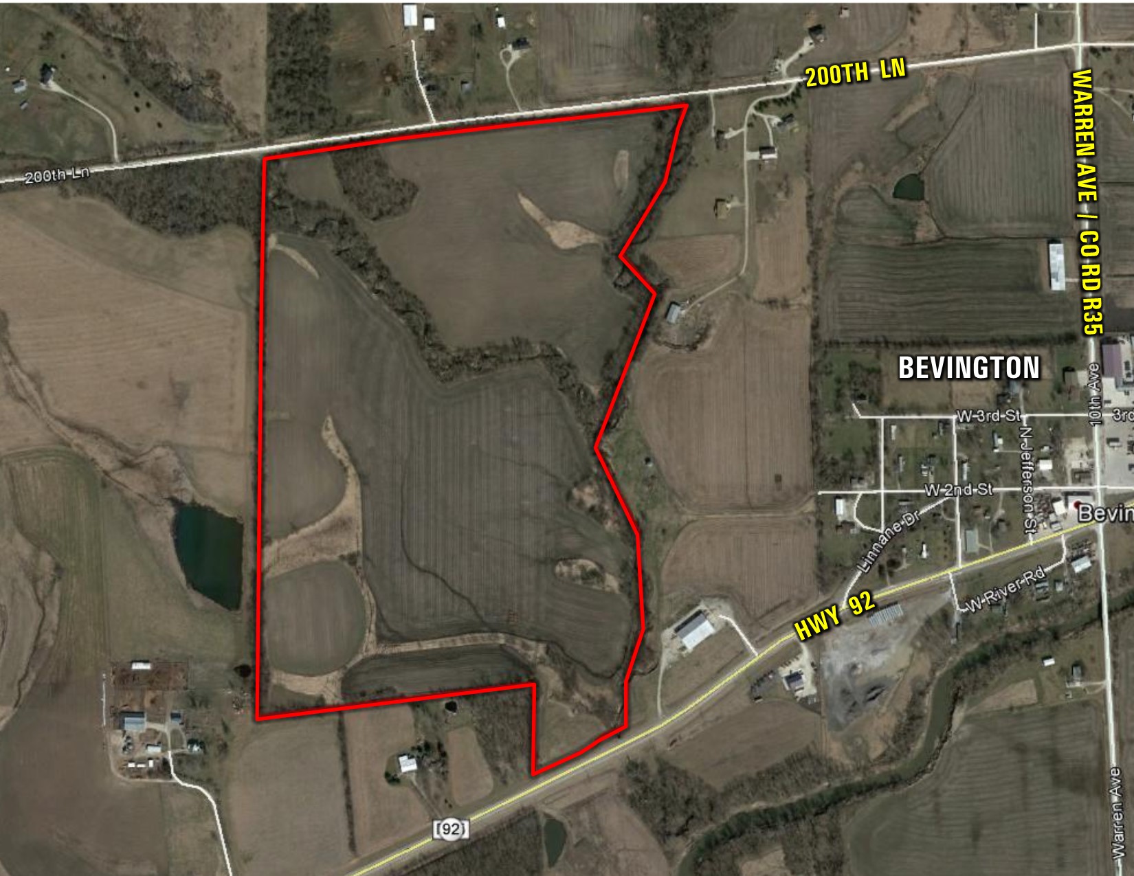 Research Parcel InformationFrom the intersection of Interstate 35 and Hwy 92 (exit 56), travel west on Hwy 92 approximately one mile. Property is situated on the north side of Hwy 92. Property can also be accessed from 200th Lane on the north side of the farm - from Hwy 92 in Bevington, turn north onto Warren Ave / Co Rd 35 and travel 0.4 miles. Turn west onto 200th Lane and continue 0.5 miles. Property is situated on the south side of 200th Lane.