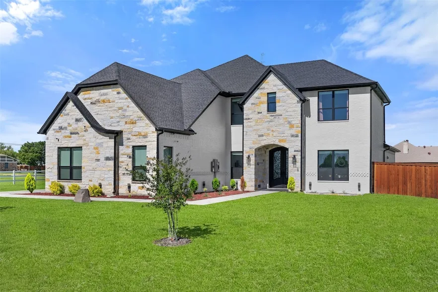 Experience refined luxury in this stunning 5-bed, 5-bath home designed to impress at every turn. Enter through grand iron double doors into a light-filled living room with soaring 20-ft ceilings, a dramatic floor-to-ceiling black tile fireplace, and a show-stopping chandelier. The chef s kitchen is a dream, featuring a 6-burner gas stove, pot filler, walk-in pantry, and butler s area with a secondary sink, ideal for entertaining. The main-level primary suite offers a spa-inspired ensuite bath and a spacious custom closet, while the upstairs includes a second primary suite for added comfort and flexibility. A dedicated office with built-in dry bar and cabinetry provides the perfect workspace. Throughout the home, you'll find designer paneling, custom closets, and generous walk-in storage. Step outside to your private resort-style backyard, complete with a heated pool, jacuzzi, and a convenient exterior shower, perfect for pool parties. The outdoor kitchen includes a wood-burning fireplace, dual built-in grills, sink, and a built-in fridge, creating an entertainer s paradise. An additional detached structure offers excellent potential for a future pool house or guest suite. Parking is abundant with a 2-car garage, 2 carports, and a driveway that accommodates up to 10 vehicles. Situated on a fully fenced lot spanning just over an acre, the property includes an electric gate for privacy, a buried propane tank, and a full sprinkler system that covers the entire grounds. Thoughtfully landscaped and enhanced with nine fruit trees, this estate is a true sanctuary. Every detail has been carefully curated to blend elegance, comfort, and modern functionality. This is luxury living at its finest.