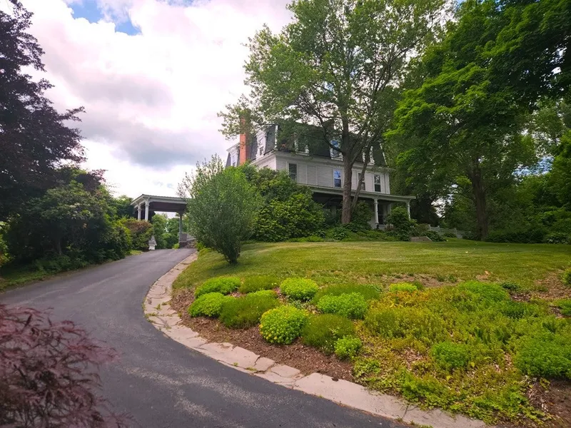Unique country estate. This stately mansard-roof colonial with porte-cochere is elegantly set on 2.75 well-manicured acres surrounded by gorgeous Audubon land. Main living space encompasses approx. 4000 sf plus addl 2-3 private suites for multi-generational living or Airbnb potential with its close proximity to Nichols College, Sturbridge Village & Brimfield. Quality craftsmanship evidenced by ornate fireplace mantels, dentil moldings, built-in nooks & wainscoting. Several stained-glass pieces incl magnificent Tiffany-inspired stained glass at entry to great rm. New pantry cabinets with granite is lovely extension of main kitchen.Gunite pool with waterfall & stamped concrete patio. Light-filled main bedroom suite w/updated bath offers slider to private balcony. Spacious bedrooms throughout. Lifetime metal roof on wraparound porches. Family rm has potential for main level bedroom. 20 windows on 2nd fl scheduled to be replaced. Wraparound porch freshly painted One-of-a-kind legacy home!