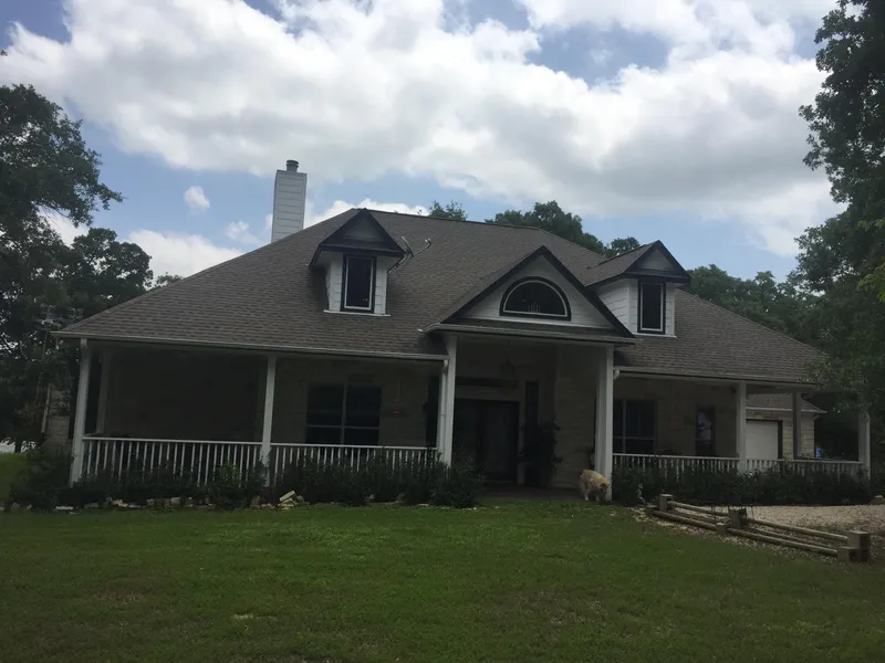 The exterior of the home is white rock, with slate-floored wrap-around porches. Over 1500 square feet of porches to enjoy being outside! Over half of these porches are screened in with plenty of room for jacuzzi, smoker, and BBQ grill! Porches are wired for electric and gas for grilling, and contain many ceiling fans for the Texas heat. Great views of the lake from the back porch area! Also, has an oversized garage with work bench.