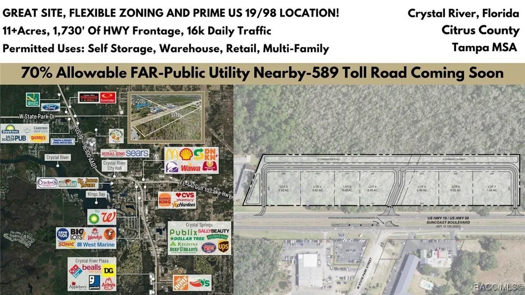 Bring your shovel and vision to this prime 11.51-acre commercial property in the heart of Florida's Nature Coast, located in the City of Crystal River, Citrus County. With 1,730+ feet of frontage along US Highway 19-a major thoroughfare with 27,500 AADT-this property offers exceptional visibility and accessibility for businesses looking to capitalize on the area's growth. Zoned CH (High Intensity Commercial), this versatile property is ideal for a wide range of commercial developments, including large-scale businesses, retail stores, quick-service and dine-in restaurants, hotels, professional and medical offices, self-storage facilities, gas stations, convenience stores, drugstores, warehouses, terminals, and shopping centers. Its strategic location provides an excellent opportunity for businesses seeking high traffic exposure and access to a rapidly expanding customer base. Positioned just north of Crystal River's Historic Downtown, the site is surrounded by trendy shops, local vendors, charming restaurants, and entertainment venues. The area is experiencing rapid economic growth, with significant new developments already underway. Among them, the former Crystal River Mall is being transformed into a 400-unit residential apartment community with mixed-use retail, bringing an influx of new residents and potential customers. Disclaimer: All information provided herein is for marketing purposes only and is not guaranteed for accuracy. Prospective buyers or tenants are encouraged to conduct their own independent due diligence. The seller, broker, and associated parties make no representations or warranties, expressed or implied, as to the accuracy or completeness of this information. All dimensions, zoning details, financial data, and other property-related facts should be independently verified. Please consult with appropriate licensed professionals before making any investment or purchasing decisions.