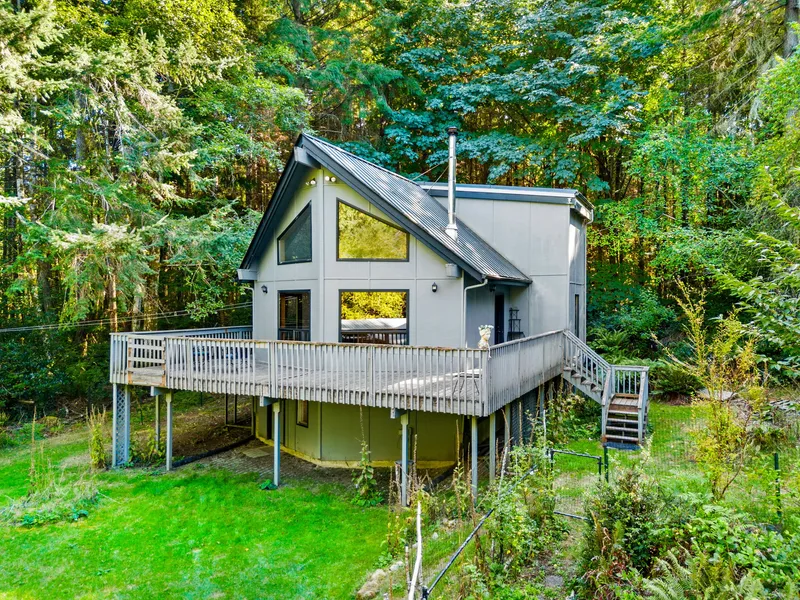 Discover this inviting Chalet style retreat nestled on just over 1.3 acres, this home combines comfort, character, and a serene woodland setting. Soaring ceilings and walls of windows fill the interiors with natural light, while the expansive wrap-around deck creates the perfect space for outdoor living and entertaining. Two detached garages provide ample storage for vehicles or hobbies. Surrounded by trees yet just minutes from the water, this property delivers both privacy and proximity to coastal living. Whether a year-round residence, weekend getaway, or investment.