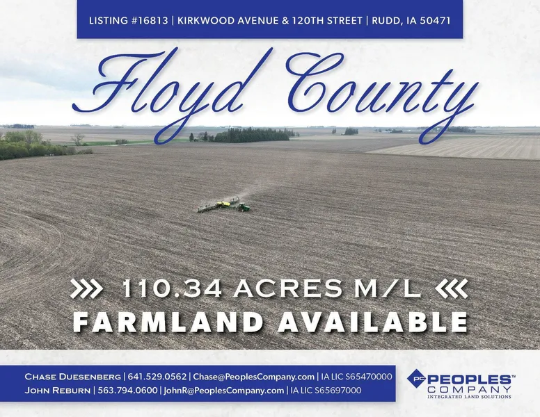 Farmland available in northern Floyd County, Iowa! Peoples Company is representing the sale of 110.34 m/l surveyed acres located north of Rudd in Section 27 of Rudd Township. The farmland consists of 107.41 FSA tillable acres carrying a CSR2 of 83.3. High-quality soil types includeOstrander Loam and Turril Loam with great fertility allowing this tract to produce quality yields over the years including 222 bushels in 2021 and 210 bushels in 2022.