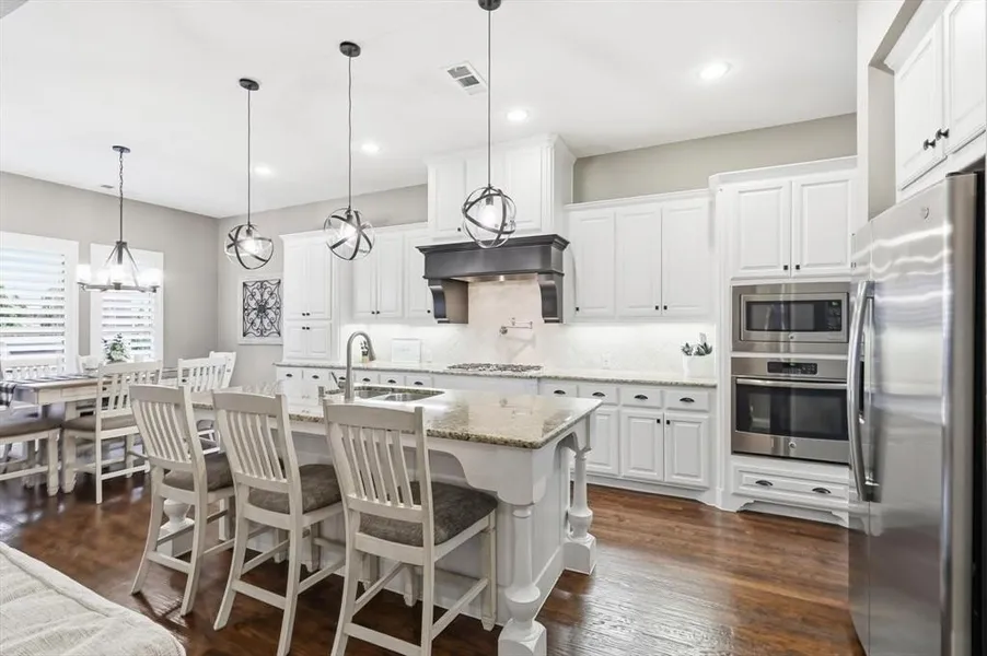 Located in the desirable Harvest community in Argyle, this impressive corner-lot home sits on a premium oversized lot and features a custom pool with dual water features, a diving pedestal, and a fully equipped outdoor kitchen designed for entertaining. The backyard includes upgraded landscaping for added privacy and a new roof for peace of mind. Inside, the home showcases over $80,000 in builder upgrades and additional custom improvements. The open-concept layout includes a media room with wet bar and powder bath, concealed theater wiring with Dolby Atmos surround sound, and built-in speakers in the family room and covered patio. The kitchen features upgraded cabinetry, granite countertops, herringbone backsplash, stainless steel sink, pot filler, and a butler’s pantry with coordinating finishes. Additional highlights include brackish-stained hardwood floors, wrought iron balusters, a raised-hearth fireplace with leuders stone and cedar mantle, and a mudroom with built-in bench. The three-car tandem garage features a professional epoxy and polyaspartic floor coating. The primary suite offers painted cabinetry, upgraded granite, a soaking tub, and elegant tilework. Throughout the home, you’ll find plantation shutters, upgraded lighting, ceiling fans, hidden TV wiring, neutral paint, and eight 4K CCTV cameras surrounding the home. Smart home technology controls the thermostats, lighting, pool, cameras, doorbell, and locks through convenient apps, and a fully paid security system monitors every window and door. The Harvest community offers multiple pools, a fitness center, coffee shop, parks, and walking trails, with convenient access to major highways, shopping, and dining, and is zoned for Argyle ISD.