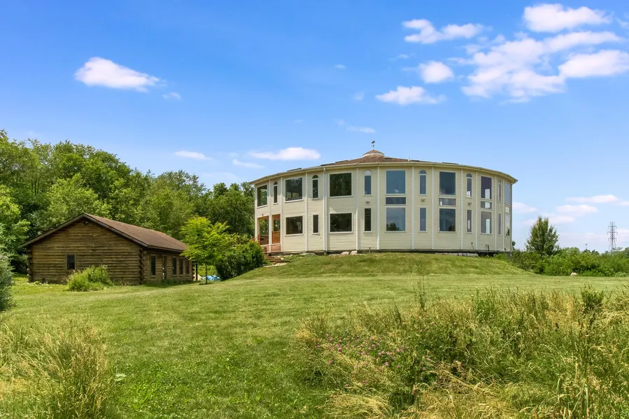 This amazing 3 story fortress is one of a kind. This remarkable round home is wind resistant and incredibly energy efficient! Situated on 14.55 secluded acres tucked perfectly in a serene, quiet and very private location surrounded by forest preserve and bike path. Featuring mature fruit trees, a stream running through the property and opportunity for deer hunting on the land. Spectacular glass doors welcome you to the open floor plan with fantastic kitchen with custom pickled birch cabinets, top of the line appliances, marble and ceramic counter tops. Geo-thermally heated and cooled with a 5 well system. An air exchange system moves fresh air through the home. Foundation walls are 11" thick with insulation on inside and out. 16x26 subgrade tornado shelter. Magnificent 3rd floor master suite features a huge custom walk in shower w/ dual shower heads and body jets, amazing custom built double vanity, 2 person jacuzzi tub with lights and radio, 16x32 loft area and balcony with perfect views of the yard. A creek runs through the property plus there's an 8ft deep pond that attracts so much wildlife! PLUS 900 sq ft log cabin w/ half bath that is currently used as wood shop. Many wood features in the home have been milled on the property. Don't miss out on this rare opportunity to own this amazing property. Priced below recent appraisal!