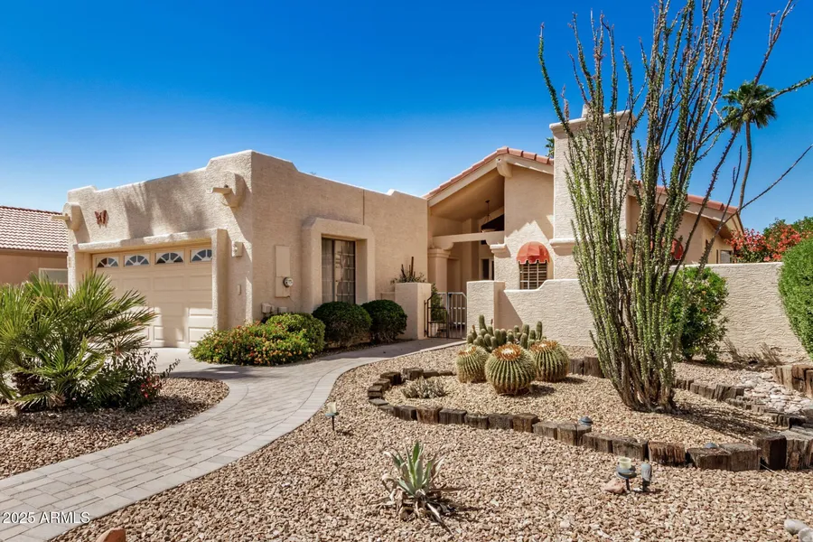 This lovely Cimarron floor plan is in the sought-after Palo Verde community on the golf course! The spacious entryway leads into a welcoming living room with a cozy fireplace, seamlessly connected to the formal dining room. The kitchen boasts granite countertops, an eat-in dining area, and ample cabinetry. Enjoy privacy from the living and dining rooms while still maintaining a connection through a window opening with a wet bar-perfect for entertaining! The primary bedroom features two walk-in closets, a full bathroom with double sinks, and direct access to the covered patio. A large guest bedroom and bath provide a comfortable retreat. Extended two-car garage. Relax on the covered patio with your favorite beverage enjoying the stunning golf course and water views. A MUST SEE.