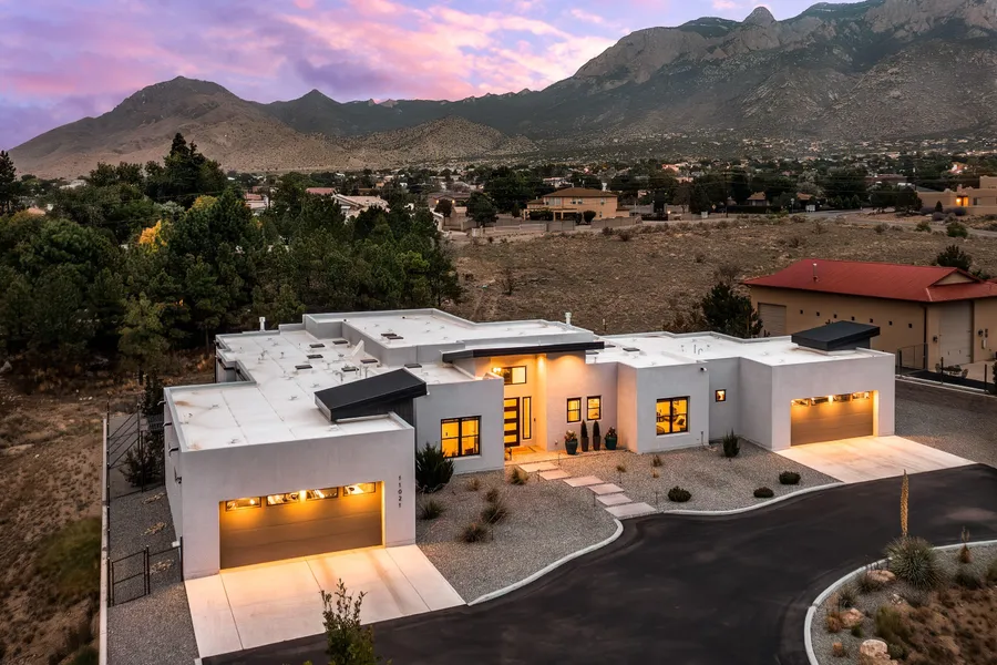 Discover your dream home in North Albuquerque Acres! 3 category Parade of Homes winner in 2022. This stunning contemporary custom residence boasts breathtaking views of the Sandia Mountains and features a rare 6-car garage, perfect for car enthusiasts or extra storage. With two luxurious full baths, this multi-generational layout offers comfort and privacy for everyone. Enjoy the convenience of an asphalt driveway leading to your private oasis. Located in the coveted La Cueva school district. The amazing kitchen is a chef's delight, featuring custom cabinets, a butler's pantry, and a 5x10 quartz island for entertaining. Energy-efficient and equipped with a private well, this home combines luxury with sustainability. Don't miss the chance to make this exquisite property yours!