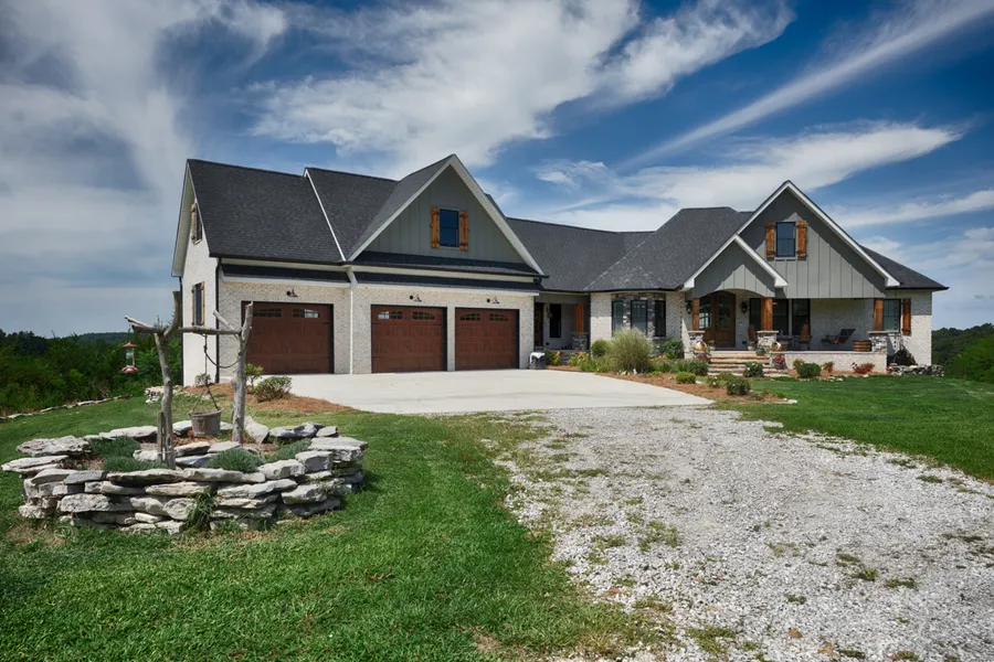 The custom built 5729 square foot home sits atop a hill on 80 acres offering panoramic views of the breathtaking countryside from every window. You wont miss the captivating sunsets, foggy valleys, or rumbling storms rolling in off the back deck, nor will you miss the beautiful sunrises off the front porch. The main level is customized farm charm, featuring over 3,500 square feet of living with 4 bedrooms, 2.5 baths, dining, eat-in kitchen, great room sunroom, and pantry. The main level also exhibits 3/4 white oak floors and custom plantation shutter/ blinds throughout, a great room with 17 cathedral ceilings (shiplap), solid cedar beams, brick columns, stone fireplace, gas logs and a solid walnut mantle; an eat-in kitchen with solid custom maple cabinets, double ovens, gas stove, quartz counters, low voltage upper and lower cabinet lighting, coffee bar, beverage frig, large pantry, etc., a large dining room with bay window, a large master suite with tray ceiling, bed-side wall lamps, built-in cabinets, and walk-in his and her closets; a large master bath with 48 vanity (hers), 36 vanity (his), iron claw-foot tub, bead-board wall accent, large shower with dual rain/spray heads; a sunroom with 15 shiplap ceilings, solid cedar beams and brick side wall, large attic for storage, spray foam insulation throughout house for tremendous heating and cooling efficiencies, black Andersen 400 clad series windows, dual American Standard HVAC units and separate mini split in sunroom.