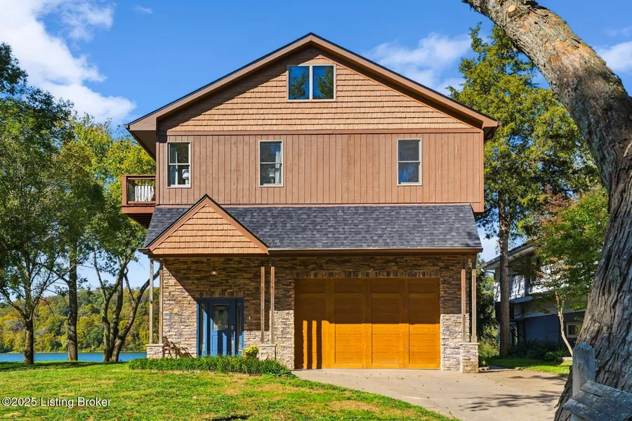 Enjoy sweeping river views and end each day with a sunset over the water. This stunning Ohio River home was designed for effortless living-whether you're entertaining on the full-width deck, relaxing by the fire-lit patio, or heading down to your private dock for a boat ride. Inside, an elevator carries you to the main living level with a vaulted great room, dining area perched for better views, and a bright kitchen with windows offering views of the ever-changing river and wildlife. The spacious primary suite feels like a private retreat, while the loft and lower-level offer plenty of flexible space. The lower level has enormous space to entertain guests with a projection TV, built-in Bourbon barrel wet bar, a full bath and flex space for a bedroom, office or hobbies. With low-maintenance materials, extra parking, and elevated construction above the floodplain, this home pairs riverfront beauty with peace of mind.