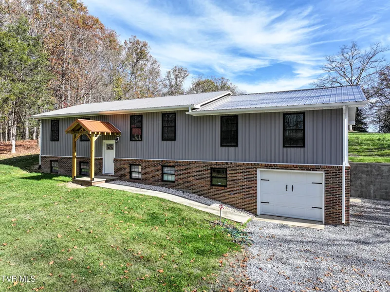 As you drive through the trees that provide privacy from the road, you'll immediately notice the impressive upgrades: a new metal roof, new siding, new front overhang, new back deck, and a solid poured concrete retaining wall. The home also features mostly new windows, ensuring energy efficiency and natural light throughout.