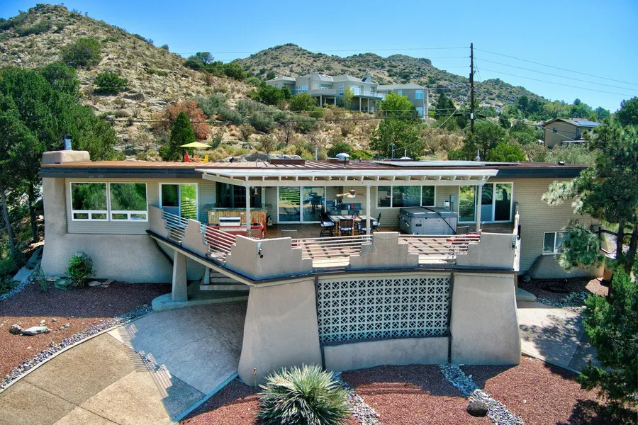 Welcome to this stunning Four Hills home with incredible city views and ideal spaces for entertaining. The backyard features a sparkling saltwater pool with a water slide, water features, automatic cover, and a pool bathroom with shower and laundry. Inside, enjoy a bright, open floor plan with a chef's kitchen--granite countertops, stainless appliances, gas stove, and space for two refrigerators. The lower level is perfect for a casita, in-law suite, or teen retreat. The spacious primary suite includes a sitting area, wet bar, two-way fireplace, balcony access with views, and three closets, including a custom walk-in. Additional perks: owned solar, metal roof, two-car garage with storage and workshop. Close to Four Hills Country Club, golf, Kirkland AFB, shopping, and trails