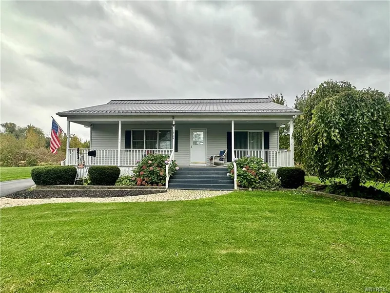 Welcome to this beautiful ranch home that sits on over 4 acres of land! This home features a large front porch, with views of Lake Ontario! Located on the side of the driveway, you'll find a 1.5 car garage with an upstairs that could be transformed into a loft or a second living area with water and septic capped and ready to go! New metal roof on house and garage, complete tear off, done in June 2023. After walking into the gorgeous home, you'll find an open floor plan including cathedral ceilings, living and dining combo as well as a large breakfast bar in the kitchen and a gorgeous fireplace located in the living room room! 1st floor laundry is located off the kitchen and down the hall, there are two bedrooms with baseboard heating! Don't miss out on this beautiful home!