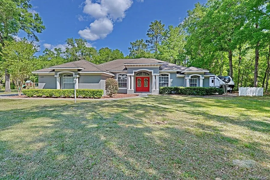 Home Sweet Home! Spacious floor plan with 2,494 sq ft of living space includes 3 bedrooms, 2 baths plus an office with a great deal of entertaining space both inside and out. Step inside your new home through the double door entry into a grand living space with formal living and dining rooms. Open kitchen with breakfast bar, stainless appliances, new lighting, pantry and kitchen nook over look the great room. Master suite opens onto the lanai, features large walk in closet, dual sinks, jetted tub and separate shower. On the opposite end of the home you will find two sizeable guest bedrooms with bathroom. Your outside oasis has a 22x26 ft screened lanai, brick paver patio with built in fire pit and over an acre of land. Freshly painted exterior in 2019, new bathroom faucets and light fixtures throughout. Location, location, location. This home is centrally located in a quiet neighborhood on a dead end street, minutes to shopping and schools, 30 minutes to both Ocala and Crystal River. Low home owners association fee of $45 a month includes access to community pool and tennis courts. Come take a private tour today!