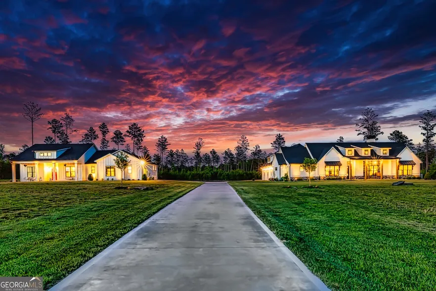 Exquisite 18+ acre family estate just minutes from historic Downtown Senoia. Custom-built in 2021, this exceptional property offers the perfect blend of luxury, privacy, and functionality. Nearly half the acreage is cleared, creating an ideal setting for an equestrian estate or multi-generational retreat. A gated entrance and tree-lined, beautifully lit driveway set the tone for the sophistication that awaits. The main residence features an elegant open-concept design with hardwood floors throughout. A gourmet kitchen anchors the home with a large island, custom built-ins, stainless steel appliances, farmhouse sink, oversized breakfast room, and walk-in pantry. The expansive family room boasts a brick fireplace and custom mantle, opening through slider doors to an oversized covered patio for seamless indoor-outdoor living. The primary suite is a private sanctuary with vaulted wood-beam ceilings, shiplap accent wall, spa-like bath with soaking tub and separate shower, and a custom closet with window bench. Secondary bedrooms share a Jack-and-Jill bath, while the upper-level bonus/bedroom with full bath offers flexible living space. Additional features include an oversized 3-car garage, foam insulation, rocking-chair front porch, and a well-designed mudroom. A beautifully crafted secondary home mirrors the quality of the main home and includes an open layout, formal dining room, brick fireplace, huge pantry, split bedroom plan, spacious laundry room, mudroom, and covered patio. Outdoor amenities include a 20-zone irrigation system, custom lighting for both homes and the driveway, two wells with oversized pumps, fencing, and 7+ cleared acres-ready for horses, gardens, or your own custom vision.