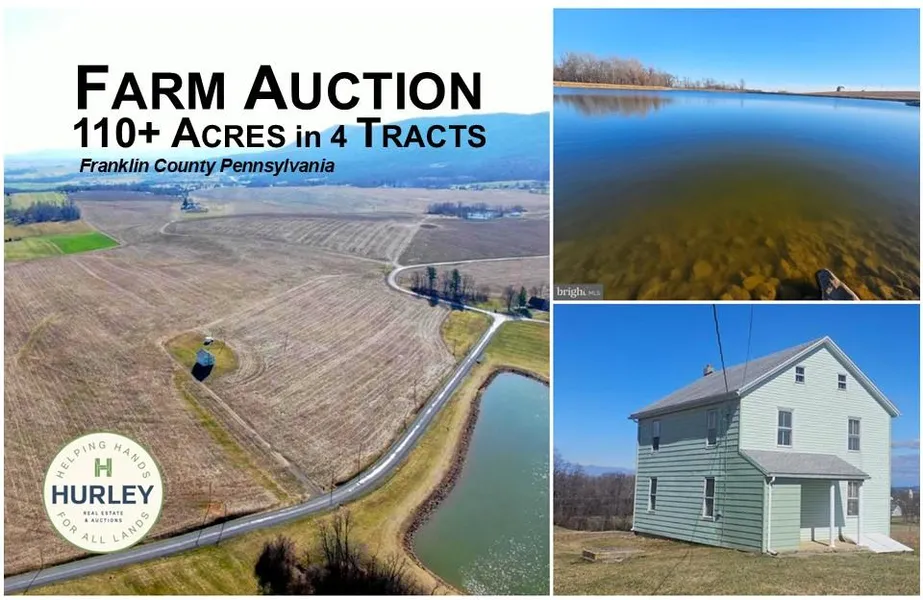 110+ACRE FARM in 4 TRACTS for PUBLIC AUCTION at 8526 Mountain Brook Rd, Chambersburg, PA 17202 on April 25, 2025 AT 1PM. Beautiful Franklin County farm! Tract 1: 26.33 Acres, 2-story 3BR, 1 bath farmhouse, nearly all tillable Tract 2: 33.56 Acres tillable. Tract 3: 20.04 Acres tillable. Tract 4: 30.11 Acres with 8acre POND, Wilson Run STREAM flows thru property, wooded & tillable. Previews Apr 12th & 17th 10AM-12Noon