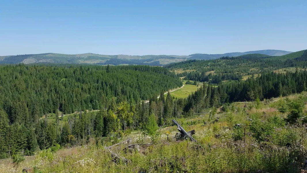 PRICE REDUCTION!!!! 5.1 acres of timbered ground with a dry cabin. Solar, generator, camper with stove, hot water, shower. Wood shed. Water tank. GREAT VIEWS. Timber company ground on two sides. Lots of wildlife. Elk, moose, deer, etc.