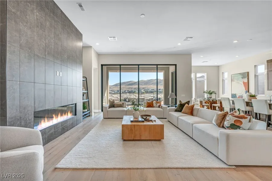 Coveted Incline single-story home in Ascension, set on an elevated premier lot with a $500K lot premium and unobstructed panoramic mountain landscape and city views. The Genoa model exemplifies modern luxury with over $400K in builder upgrades, including engineered wood flooring, Maple-Thatch stacked cabinetry, and Honeywell WiFi smart-home technology. A chef’s kitchen showcases a Signature stainless steel appliance package, including 48" gas range, 42" built-in refrigerator, and Level 5 quartzitic marble countertops and backsplash. The great room boasts 12' ceilings, a sleek gas fireplace with tile surround, and 16' multi-stacked sliding doors opening to a covered patio with a gas fireplace and BBQ stub. The spa-inspired primary retreat offers direct patio access, a soaking tub, dual vanities, and walk-in shower. Add'l highlights include a Tesla EV charger, tankless water heater, water softener, epoxy-finished 3-car garage—an exceptional home of design, technology and tranquility