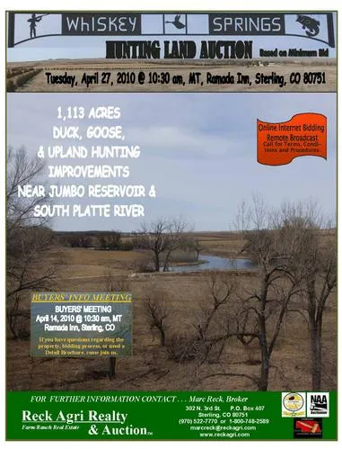 1,113 Ac for sale, "WHISKEY SPRINGS HUNTING LAND”. Located Northeast of Crook, CO in Northeastern Colorado and in Logan & Sedgwick Counties, the property is easily accessible from I-76 and I-80 and 110 miles NE of Denver, CO. Located 3/4 mile north of Jumbo Reservoir, 4 1/2 miles north of the South Platte River, and in an area which includes thousands of acres of irrigated corn, CRP, and dryland & irrigated wheat, providing a major DUCK and GOOSE FLYWAY and UPLAND HUNTING environment. With the open waters of the Jumbo Reservoir and the live stream which feeds 4 stocked ponds on the Whiskey Springs Property, creates a safe haven for waterfowl. Whiskey Springs location and safe haven environment combined with over 206 acres of food plots planted to dryland alfalfa, wheat, millet & corn, 11 goose pits, and with over 90 miles of trees planted within wildlife shelterbelts on the property, thus providing an ideal waterfowl and upland hunting experience. This hunting experience includes Canadian & Snow Geese, the following species of ducks: Mallards, Blue Wing Teal, Green Wing Teal, Wood Duck, Golden Eye, and assorted Divers and Paddlers, Pheasant, and other upland game birds of your choice as there are numerous game bird farms in the area. Whiskey Springs operates with a commercial park permit which allows upland hunting from September 1 to March 31. The Whiskey Springs Property lends itself to other opportunities which compliment the waterfowl and upland hunting experience such as hosting state, regional, and national Bird Hunting Dog Trials; Weddings; Reunions; and is outfitted for Handicap Accessible hunting. Improvements for overnight lodging and support staff include 4 bedroom home, 3 bedroom bunkhouse, dog kennels, bird cleaning facility, barn, and shop.