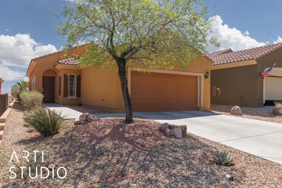 SID PAID IN FULL! This well-maintained home offers an east-facing backyard with a 180-degree mountain view to the east, northeast, and southeast—visible from the kitchen, dining area, living room, and main bedroom. Step inside to find fresh interior paint and luxury vinyl plank flooring throughout the great room, dining area, hallway, and all three bedrooms. The entryway, kitchen, bathrooms, and laundry closet are finished with tile for easy upkeep. Enjoy a new water softener system (installed just 90 days ago), a new washer/dryer set, and a new refrigerator—all included in the sale at no additional cost. Ceiling fans are located in the great room and main bedroom, and new smoke detectors have been installed. The covered patio is perfect for relaxing while enjoying the beautifully landscaped backyard, expansive mountain views and sunrise views. As part of the Sun City Mesquite community, homeowners enjoy access to a 30,000 sq. ft. pioneer center. Whether you're looking for a full-time residence or a low-maintenance getaway, this home offers comfort, convenience, and stunning views—all in one of Mesquite’s most desirable 55+ communities.