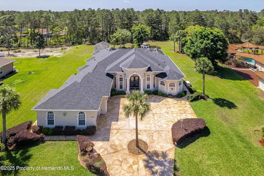 TOUCH OF CLASS...This Custom 1 Acre Estate with a Designer Pool in Woodland Waters Subdivision is Just STUNNING. Love the Private Backyard that offers trees for Natural Privacy, a 280 sf ''She Shed'' or Workshop and Pretty Steps to the Gazebo. The Back is set up for Entertaining Family & Friends with a Spacious Screened (New Screening in 2021) Lanai which is Partially Covered & a Gorgeous Solar (installed in 2021) HEATED POOL with Ornamental Spouts. A Designer's Touch with Arches, Double Doors & Transom Windows as you Enter through the Front Entry to a High Coffered Ceiling Foyer with Chandelier Plus Immediate View of the Pool & Gazebo as you Step into your home. To the Right is the Office with Bay Windows & Plant Shelves. To the Left is the Spacious Formal Dining Room which also has Bay Windows. Step further into the Formal Living Room which is the Room with the View & a Cozy Fireplace. The Cook's Kitchen offers Wood Cabinets with Crown Molding, Kitchen Island, Breakfast Bar, Granite Counters & Backsplash, Walk in Pantry & Stainless Steel Appliances: Convection Built in Oven, Built in Microwave, Double Door Refrigerator & Dishwasher. Right off the Kitchen is a Breakfast Nook with Bay Windows overlooking the Pool Area. The Fun Room in this Home is the Family Room in the Back & Right off the Pool Area. Trey Ceiling, Wet Bar & Fire Place plus Large Enough to make it a Game or TV Room or Just a Place to Gather with Friends & Family. Right Next to the Family Room is a Full Bathroom for Guests. The Primary Ensuite has the WOW Factor. Not only a Bedroom but plenty of Space for a Sitting Area. His & Her Closets... And the Award Winning Bathroom with a Soaking Jetted Tub in the Middle of the Room, Huge Two Head Shower with Seat Plus Separate Vanities. The Two Guest Bedrooms are Separate from the Primary Bedroom to offer Privacy. One of the Bedrooms is an ensuite too with a walk in closet. The Bathroom for this Bedroom has two accesses - one from the Bedroom & the other from the Hallway. The Laundry Room is very functional with a Folding Table, Built in Desk, Laundry Sink, Cabinets Plus Speed Queen Washer and Dryer. There is a 3 Car Garage with a Storage Room with 4 Large Storage Racks. Current Owner is Particular & Has Maintained this Home: Newer Interior & Exterior Paint, 2021 Whole House Generac Generator, 2021 Three Dimensional Roof for the Main House & 2023 for the ''She Shed'', 2020 HVAC System & 2021 Water Softener. Woodland Waters is a Sought-After Community due to its Natural Beauty & Low HOA Fees ($175 per YEAR) plus It's Upscale Tranquil Living. Although off the beaten path, it is not far from all Amenities.
