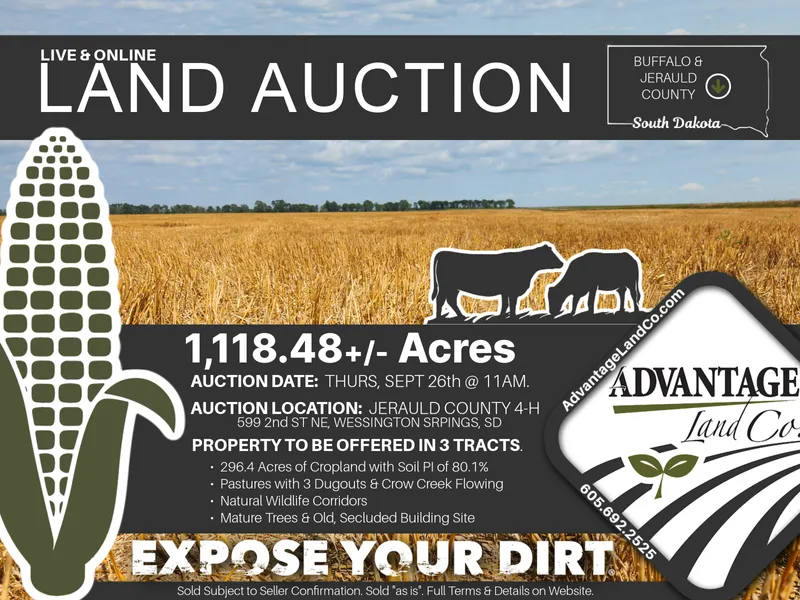 Advantage Land Co. proudly presents 1,118.48+/- acres of cropland, fertile hayland, picturesque pastureland and wildlife habitat nestled in the known agricultural area near Gann Valley, South Dakota. This property consists of 296.4+/- acres of majority Class II dirt between the three tracts with an average of an 80.1% productivity index. Crow Creek finds its way through this property providing a fresh water source and a corridor for ring-neck pheasants and whitetail deer, all with beautiful scenery as a backdrop. FSA reports a total of 301.32 Cropland acres with a total of 202.90 base acres comprised of a 44.60 acre Soybean base with a 39 bu PLC yield, a 50.7 acre Wheat base with a 33 and 45 bu PLC yield, a 40.20 acre Sunflower base with a 973 and 999 lb PLC yield, and a 67.40 acre Corn base with a 79 and 95 bu PLC yield. This area comes natural to wildlife of all kinds including upland game birds and North Americas #1 game species, the tall-tined whitetail deer, providing all kinds of excitement for every outdoor enthusiast. Boundary pins have been placed recently for Tract 2 on the North to determine the property lines. With all this property has to offer, youre going to want to take ADVANTAGE of this opportunity to leave a lasting legacy and bid to buy on September 26th in Wessington Springs!