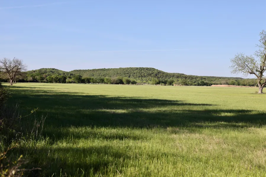 Mostly level to sloping to high points with approx. 200 feet of elevation change. Many post oak, pecan, and mesquite trees, and some live oak, elm, and cedar as well. Wheat and coastal bermuda fields.