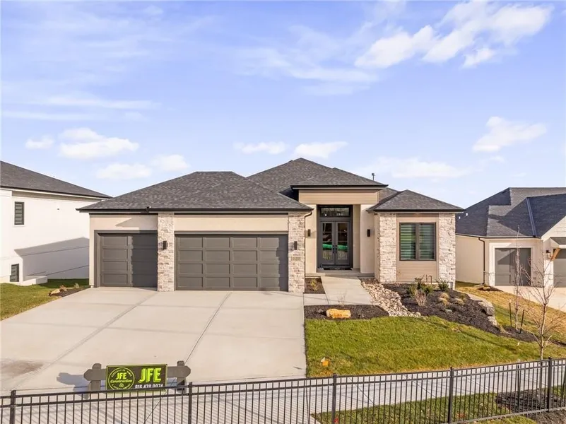 JFE Construction brings their fabulous Bayberry Rev. 1.5 sty plan to Johnson Counties newest maintenance provided community of Prairie Canyon! This beauty sits on a walkout lot with SE rear exposure backing to greenspace w/dramatic long vistas! Cathedral vaulted ceilings in the entry, Great rm & thru to the covered deck with FP. Open concept plan with Great rm., kitchen & dining all open to each other, large island & spacious pantry. Two bdrms & 2 baths on the main floor, 2 bdrms. & 1 bath down with plenty of Family & recreation space which includes a fantastic wet bar!