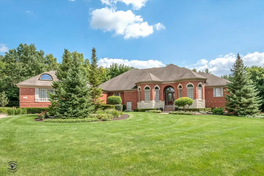 Quality construction is evident in every square foot of this luxurious ranch home which is located at the end of a cul-de-sac on a quiet 1.34 wooded acre site near The Sanctuary Golf Course. Brazilian cherry floors welcome you from your first step into the beautiful foyer. Soaring ceilings, expert craftsmanship, and an open floor plan await. 12 foot coffered ceilings invite you in to the central great room complete with fireplace and transom windows. Enjoy a chef's dream kitchen with quartz countertops, center island, two breakfast bar seating areas, Deluxe Kitchen Aide appliances, double ovens and dinette area. The spacious primary bedroom suite features an en suite bathroom with jetted tub, two sinks/vanities, a separate shower/ commode room and a door out to a private 3/4 walled patio. Two other main floor bedrooms on the other wing of the home share a Jack and Jill bathroom. You'll love the recently finished basement which features radiant floor heating, daylight windows, enormous entertainment room with full brick fireplace, game room, exercise room area, 4th bedroom with en-suite shower bathroom, additional guest half bathroom, and an ample workroom/storage room with a separate stairway to the garage. Other upgrades include: Mud room with locker cabinets * Large main floor laundry room with deluxe cabinetry* Radiant heated oversized three car garage * Lovely paver patio with half wall off kitchen* 10 foot ceilings on main floor and basement * Energy efficient furnace * Upgraded 2 x 6 exterior wall construction* Sunny yard space plus wooded privacy * Pella Windows* Gorgeous House...Wonderful Yard...Perfect Location! One Year Cinch (HMS) Home warranty provided to buyers by sellers!!