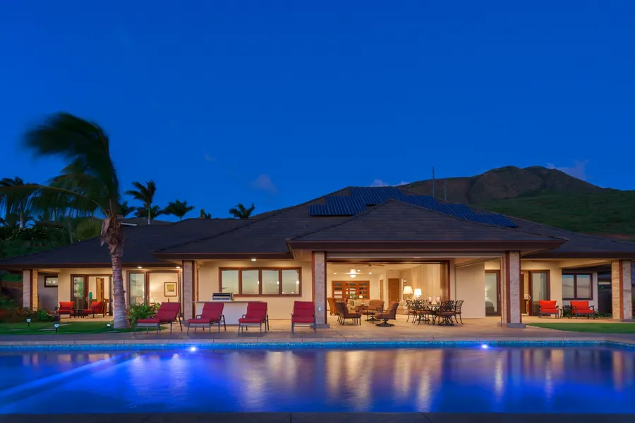 Enjoy incredible views of the ocean, outer islands, and sunsets year-round from this stunning estate situated on 9 acres. This single-level luxury home offers perfection in open-concept living with a vaulted great room, dining area, gourmet kitchen appointed with high-end (Sub-Zero, Wolf) appliances, quartz waterfall island with seating, and walk-in pantry. Glass pocket doors open to the covered lanai, barbeque area, and pool & spa. Master suite built with luxury in mind: 2 walk-in closets, make-up vanity, dual sink vanity, 180-degree double walk-in shower, soaking tub, and rock wall outdoor garden shower. Second master suite, 2 additional guest suites, media room, and office/study; all beautifully finished with plank tile flooring, plaster & tile accent walls, and 8 mahogany doors. Separate den with 5th bedroom and bath, connected by the lanai roof, is perfect for guests. Additional features: private entry gate, central AC, security system. Take advantage of pre-construction on this lot and make it your dream home! Completion expected early 2022. Disclaimer: Sample images shown of completed home(s) built by the developer DO NOT depict the actual construction as this home; developer reserves the right to make changes during the construction, and completed project may deviate from images shown.