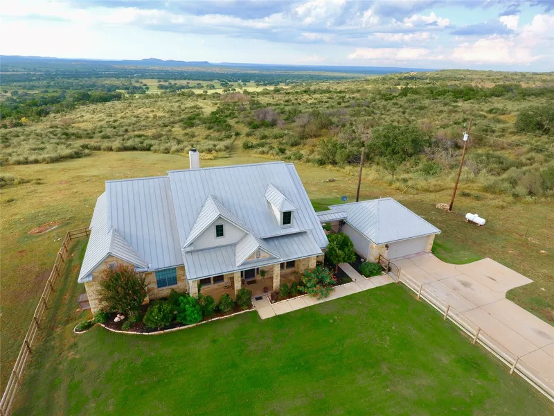In the heart of the Texas Hill Country, a one story custom home on 10 acres is perfectly situated on elevated homesite, offering a sought after panoramic view of PackSaddle Mountain. Enjoy gorgeous sunsets from your expansive patio, overlooking a pristine area surrounded by larger tracts of land providing seclusion, privacy & peaceful tranquility. Rooms are of generous proportions. Featuring an array of upgrades, this home includes a gourmet kitchen with granite island, solid wood cabinetry, 24gauge Galvalume Roof 50 year life, built in bookshelves, crown molding, massive stone fireplace with custom mesquite mantel, stone archways & plantation shutters. Exterior is Texas Limestone featuring two dormers. Primary Retreat offers wall of floor to ceiling windows displaying stunning views. Primary bath features a soaking tub & separate shower. Don't miss this rare opportunity to own a Hill Country gem with amazing views! Schedule your private tour today!