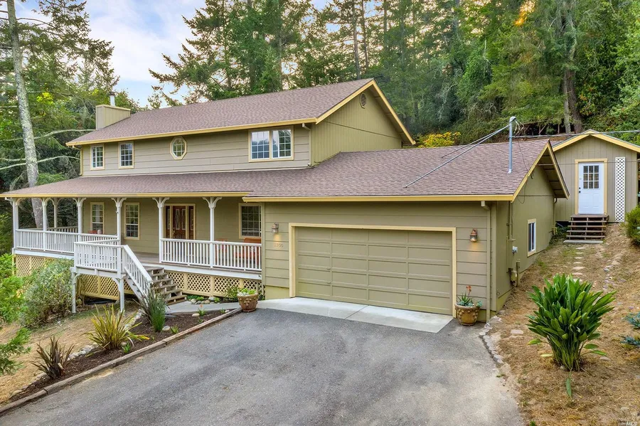 Located up a paved, private Lane and perched on a hill amidst native woodlands is this beautiful country farmhouse, complete with a stunning wrap around porch. Features include a large living room with a cozy wood burning fireplace, a formal dining room, family room/den, air conditioning, a generator, and a spacious gourmet kitchen, complete with stainless appliances and beautiful hardwood flooring. Next to the house is a sizeable studio that boasts shiny paver flooring and raised ceilings...making it a perfect home office or guest quarters, or place for that home gym. Approximately 5 minutes from the Sebastopol city limits. This home is close to all conveniences.