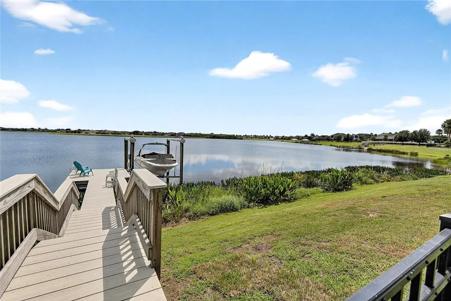 AMAZING WATER VIEWS, BOATING, AND WATERSKIING, ALL IN YOUR VERY OWN BACKYARD AT LUCAYA LAKE! Welcome to this incredible lakefront home that was an original model for the GATED LUCAYA LAKE CLUB community. With 4 Beds and 3 Baths, plus a home office and bonus room, the floorplan is ideal for everyday living and entertaining. Step inside to tall ceilings, luxury finishes, and gorgeous LVP flooring that runs throughout the main living areas, bonus room, home office, and the primary bedroom. The floor plan is open and airy and starts with a formal dining room opposite the foyer from the home office, with French doors for privacy and quiet. Next is the kitchen with a large working island with a breakfast bar, lots of counter space and cabinet storage, a closet pantry, and stainless-steel appliances that include a gas range and double ovens. All this overlooks the casual dining area and a spacious great room with sliders and views of the lake. The smart design features three wings to the home. The first is the primary suite with walk-in closets and a stunning bath with high-end finishes. The second is the bonus room with a full bath and bedroom, ideal for an in-law suite, and includes a separate entrance. The third features two more spacious bedrooms and another full bath. Extra home features include overhead storage in the garage, a whole-house generator, and hurricane shutters. With cooler months around the corner, the screened lanai is the perfect spot to enjoy the beautiful water views and entertain by putting the custom, teak wet bar with storage to good use. Or take your boat on the lake from your dock that was constructed in 2022 with composite decking, which is shared with one immediate neighbor and features an electric boat lift rated for 7,500 lbs. For active lifestyles, the community amenities are a short walk next door and include a resort-style pool, splash pad, and 24-hour fitness center. Thank you for your interest in the beautiful home and for taking the time to see it in person.