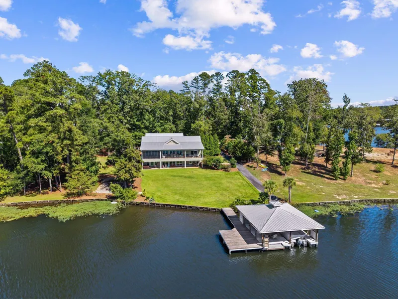 ONE OF LAKE SINCLAIR'S FINEST! ACRE+ PARK-LIKE LOT w/ BIG VIEWS. GORGEOUS RANCH w/ FULL TERRACE LEVEL. SEPARATE CHARMING GUEST HOUSE. QUALITY CONSTRUCTION - 230+ FEET WATER FRONTAGE - DOUBLE MAX BOAT HOUSE. Builder's own custom home with premium split floor plan - two bedrooms upstairs and two downstairs. Each of the four bedrooms has it's own ensuite with walk-in closet and lake views. Convenient powder room on each level for guests. Open kitchen keeps chef connected with family/company. Tasteful and spacious vaulted great room with pickled ceilings - beautiful hardwood flooring and windows and doors spanning the lake with BIG views from everywhere! UPPER AND LOWER DECKS AND SCREENED PORCH SPAN THE FULL HOME WITH MAX LAKE VIEWS! Terrace level will not disappoint with the wet bar, extra flex room and storage! SEPARATE GUEST COTTAGE - a one level ranch (built with seniors in mind)- features bedroom suite, separate office, kitchen, laundry, powder room and lakeside screened porch. Outdoor shower. So much more! QUALITY CONSTRUCTION, QUALITY LAKE FRONTAGE. FEE SIMPLE. NO HOA.