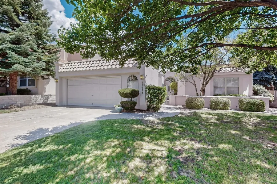 Lovely single story 2 Bedroom 1.75 Bath home in gated Tanoan Country Club! Enter through a charming courtyard into the open foyer/ main living area with wet bar and gas fireplace. Sunny kitchen features large island and opens to second living area. Spacious primary suite with walk-in closet, double sinks, walk-in shower and soaker tub. Oversized 2 car garage, fully landscaped front and backyard, top rated schools - Backs to golf course!