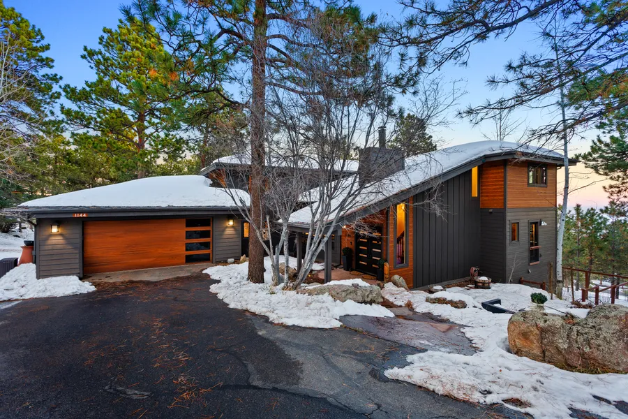 Experience mountain luxury living in this beautifully remodeled home, set in the private Golden community of Genesee. Located centrally for easy access to both I70W into Evergreen and I70E towards Denver, the spanning 4,777 square feet residence offers 5 bedrooms, 4 bathrooms, and breathtaking panoramic views extending to the Denver Skyline and beyond. On a .51-acre private lot, mature trees and rock formations blend effortlessly with the updated modern design. Inside, the main level flows from the attached 2-car garage with built-in storage to a stunning, newly professionally designed kitchen, mudroom and dining room with deck. The first of 5 bedrooms is currently being used as a home office, complete with an attached half bath. Two grand family rooms, vaulted ceilings, wood-burning fireplaces, and a second deck finish off the main level. The upper level is designed for privacy and relaxation, with two secondary bedrooms sharing a well-appointed updated bathroom with double sinks. The dedicated oversized Primary wing offers a sanctuary with an updated 5-piece primary bathroom and bonus room, featuring the home’s third wood-burning fireplace. This space is ideal for an office or nursery. The fully remodeled walk-out basement is a home within a home featuring a second primary bedroom with ensuite bathroom, a full kitchen, home gym and abundant storage space. This versatile space caters perfectly to multi-generational living. Rounding out this special home is a new roof, siding, and windows, making this move-in ready Genesee Gem a rare find. Embrace mountain living with city convenience and get ready to enjoy one of the nicest homes in Genesee.