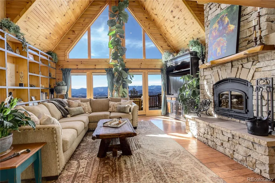 Luxurious log home with panoramic views! Sunny, south facing, paved driveway with beautiful aspen trees welcomes you to this immaculate 5 bed, 4 bath, 4,966 sq ft home on 2+ acres with picturesque views of Mt Rosalie, Lions Head, Mt Blue Sky & more. Mountain charm surrounds you with custom design features include wood beams, window seating, corrugated metal walls & stained concrete floors. The vaulted 2 story ceilings with ample windows & skylights make this open floor plan light & bright. The family room features a stately floor-to-ceiling stacked stone wood fireplace, rustic mantle, built-in shelving & wall of windows to soak in the views. The spacious kitchen with island, granite counters, custom backsplash & SS appliances is well configured & opens to the dining room for easy living & entertaining. Enjoy magnificent mountain views from the LARGE upper deck accessible from 3 rooms. The main floor primary ensuite features stack stone gas fireplace, walk-in closet & 5-piece bath with jetted tub. The upper-level features 2 large bedrooms, full bath, loft & separate game room wing with 1/2 bath, wet bar & stairs to garage. The lower walk-out basement level features 2 bedrooms (non-conforming), bath, 2 storage rooms & versatile great room with wet bar. Perfect layout for multi-generational living. Immerse yourself in the Colorado lifestyle on the large, covered patio, stunning atmosphere & abundant wildlife, while relaxing in the saltwater hot tub. Pride of ownership with thoughtful updates & meticulous maintenance. New stain/seal & paint (2024), newer class 4 roof (2022), newer solar panels (2023), radon system, well pump, mitigation & whole house generator. Upper acreage offers a level area for garage, workshop or RV storage. This property is a serene, luxury mountain resort! Close to 285 for convenience & accessibility. County maintained roads, school bus route & top ranked schools. Welcome to your Colorado dream home! *** See virtual tour with floorplan.