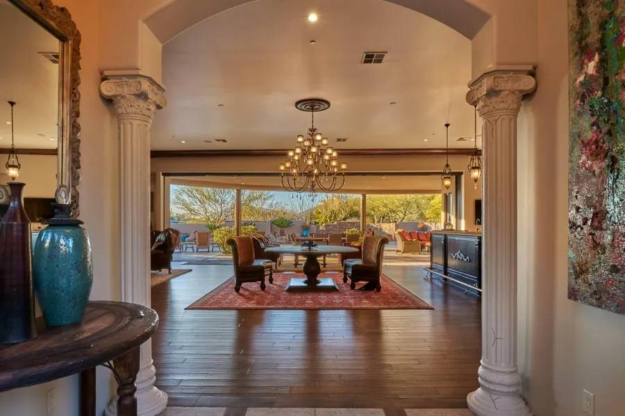 FULL GOLF MEMBERSHIP AVAILABLE WITH PURCHASE OF HOME AND DM APPROVAL. Spectacular open great room plan in the incomparable community of Desert Mountain.The absolute best home you can find for entertaining!! Great room offers gourmet kitchen with double refrigerator/freezers, double dishwashers, double sinks, warming drawer and microwave; state of the art 7.5'X2.5' fireplace, 64'' plasma TV niche, motorized window wall, 10'' crown moulding. Wine room with label-facing racking system. Master suite and ''spa'' with private ''Tranquility Garden'', steam shower and owners' private sanctuary with mahogany mantle and estate fireplace.Hand crafted double vanities throughout. Furniture is available. No art/sculptures included.