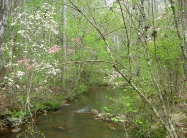 Attractive native azaleas growing along the rock-bottomed creek are a spectacular sight in the spring. About 15 acres at the back of the property, on the far side of the creek, was clearcut in 2014 and replanted with loblolly pine. For the next 10 years as this pine grows it will provide a good source of food and cover for wildlife.