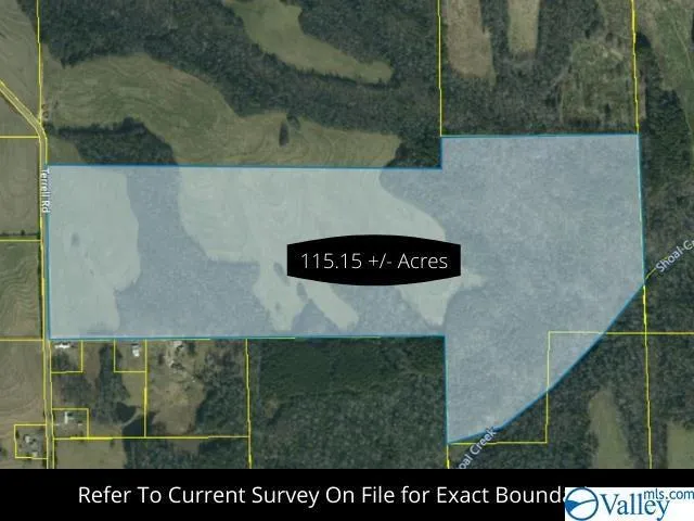 +/- 115 acres with +/-1100 feet of road frontage and large hayfields that would be perfect for a cattle and horse farm. The property has approximately 1800 feet of bluff frontage overlooking Shoal Creek that would be perfect for building your house of a lifetime and not have to worry about the neighbors. The area has abundant Whitetail Deer and small game if you wanted your own hunting property or just want to watch the wildlife. Property facts to be verified by buyer or buyers agent.