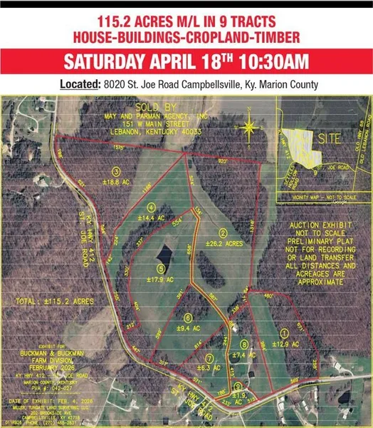 We are having an ABSOLUTE AUCTION for Ronald & Suzanne Buckman and the late Charles Buckman for 115.2 acres m/l in 9 tracts at 8020 St. Joe Road Campbellsville, Ky. in the Jessietown Area in Marion County on April 18, 2026. This is a well-manicured, maintained farm that will offer many different tracts from cropland, pasture and wooded tracts with TIMBER!! The timber has a value of $95,000 landowners share. Keep an eye out for more information to come in the following weeks.