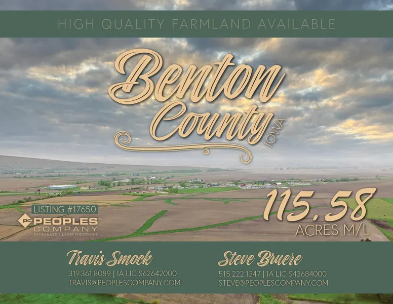 High-Quality Benton County, Iowa Farmland Available! This farm offers 115.58 acres m/l of quality farmland consisting of 114.94 FSA cropland acres, of which approximately 109.04 acres are currently farmed. Soil types on the farm include the highly productive Clyde-Floyd complex, Kenyon loam, and Readlyn silt loam, carrying an excellent CSR2 of 84.3. Tile has been added to the farm to improve drainage, but tile sizes and locations are unknown. Previous pasture acres in the northeast corner have been converted to cropland by the seller to increase farmability and production. The farm is located conveniently near Interstate 380 with developing commercial and industrial buildings to the west of the property, offering potential upside in the future. This farm would make a great add-on to an existing farm operation or a long-term investment to hold as industries develop near Urbana. The farm is currently leased with a strong local operator and contains an option to extend for the 2025 crop season at an attractive lease rate if the new buyer elects to assume the lease. Contact the Listing Agent for details.