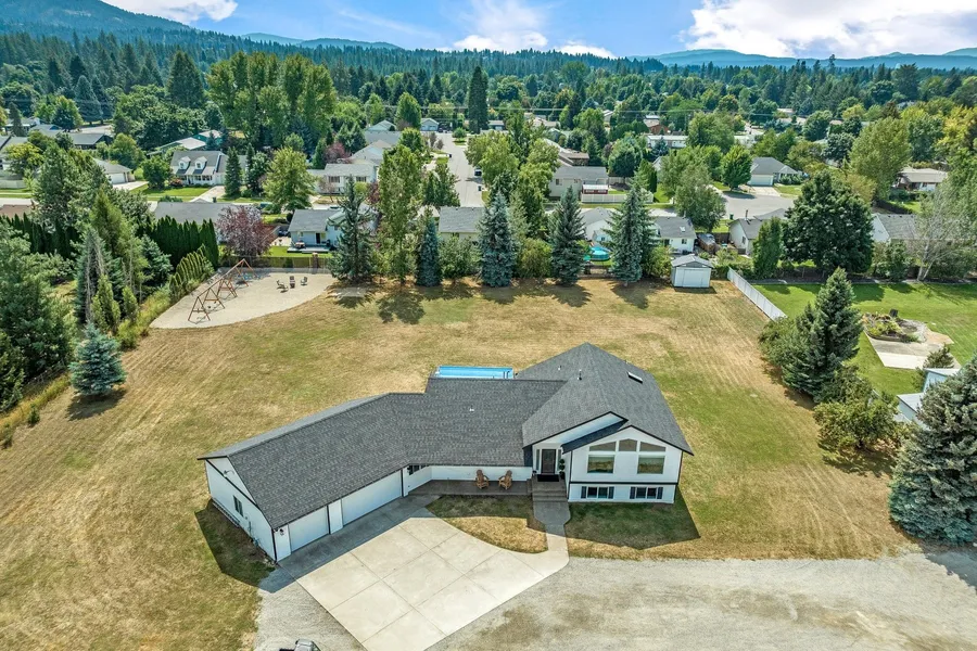 Unparalleled privacy and a remarkable home set on a rare and expansive 1.58-acre lot in town with the ability to subdivide! Fully fenced flag lot offering a unique blend of space, seclusion, and convenience that's hard to find. Renovated in 2020, this home boasts a new roof, water heater, furnace, and AC, ensuring peace of mind and efficiency. The multi-level layout features a spacious open entry, custom stair railing, open living area, vaulted ceilings, and picture windows that flood the space with natural light. The kitchen is a chef's dream with a walk-in pantry, skylight, and quartz countertops that complement the modern aesthetic of the home. The primary suite with his and her walk-in closets, large bathroom and sliding door access to the patio. Large bonus room provides flexible space for a home office, entertainment area, or playroom. Ample storage throughout. Oversized 3-car garage and work-out space. Playground and above ground pool. Plenty of room to add a large shop. Just a short drive from Avondale Golf Course, Hayden Lake Country Club, Hayden Lake, and Honeysuckle Beach.