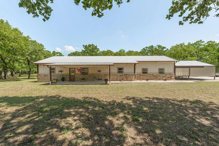 Embrace country living on this beautifully appointed 4-acre retreat tucked beneath a canopy of mature oaks just outside Stephenville. This versatile property blends comfort, functionality, and timeless rural charm. The 1,696 sq ft main home offers 3 bedrooms, 2 bathrooms, and an open-concept layout with a central island, pantry, walk-in closets, decorative lighting, and a cozy propane fireplace. Durable polished concrete floors run throughout, creating a warm, low-maintenance interior. Enjoy tranquil views from the large covered front and back porches, perfect for relaxing or entertaining. A 350 sq ft bonus room expands living options for hobbies, a home office, a game room, or a fitness space. An oversized carport provides ample covered parking, and established RV hookups add extra convenience for guests or travelers. The insulated 30x40 workshop includes a sink, two 220V outlets, and a 10x40 overhang ideal for projects, equipment, or additional storage. Connected to the shop is a 385 sq ft bunkhouse with a full bath, suitable for guests, rental use, or a private workspace. The fully fenced property includes an equipment shed with a livestock stall and a finished well house that doubles as secure storage or a small office. With open space, fencing, and outbuildings in place, it is well suited for horses, 4-H or FFA projects. Total estimated living area is 2,431 sq ft, combining the main home, bonus room, and apartment in the shop. Located in the Stephenville ISD, this rare country property offers flexible living, privacy, and the space to truly thrive. Portable shed and shipping containers are excluded from the sale.
