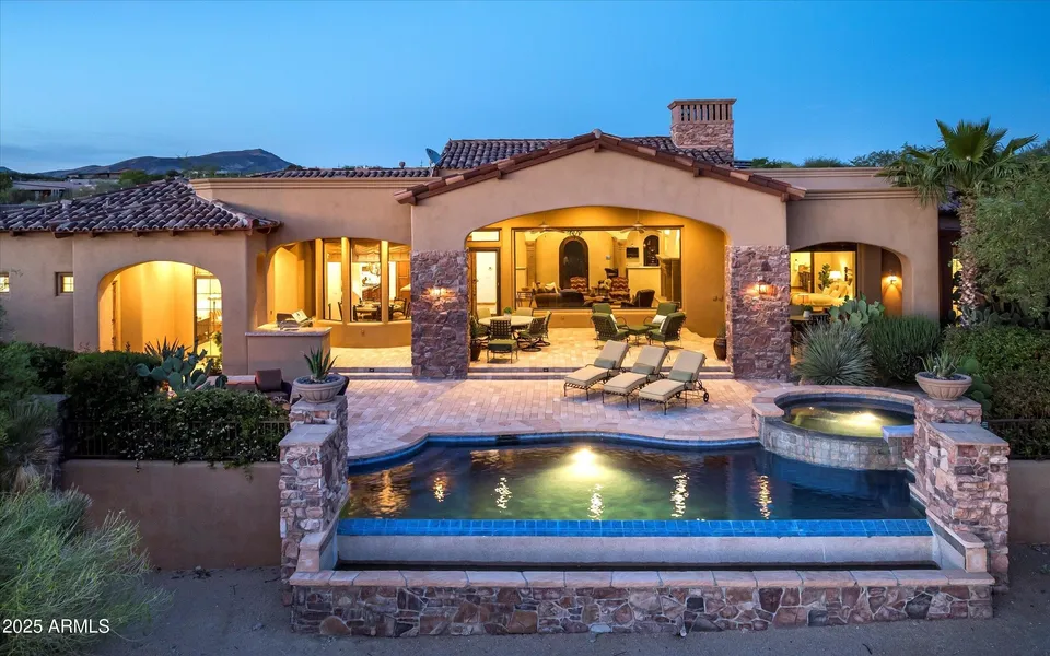 Golf Membership Available - No Wait! - Perfectly positioned on a quiet cul-de-sac in the village of Painted Sky, this single-level masterpiece sits on an elevated lot overlooking the 12 fairways of the Apache Course with breathtaking views of Arizona's mountains, dramatic sunsets, and twinkling city lights. A private drive and lush desert landscaping create a grand sense of arrival. Inside, a sophisticated open floor plan unfolds with soaring beamed ceilings, expansive view windows, and a seamless indoor-outdoor flow ideal for luxury living and entertaining. The chef's kitchen is equipped for culinary excellence, while the entertainer's wine cellar and full bar elevate every gathering. A richly appointed office/library provides the perfect work-from-home sanctuary. The luxurious primary.. suite is a true retreat, offering dual spa-inspired baths, two oversized walk-in closets, exercise room and private patio access. Guests will enjoy their own wing with three ensuite bedrooms, ensuring comfort and privacy for all. Outdoors, the resort-style patio is designed for year-round enjoyment with expansive covered living and dining areas, two private shade patios, and a sunny poolside deck featuring a fire-pit lounge and TV area. Generous storage and exquisite designer touches complete this remarkable home. Furniture is included with the exception of a few small pieces. Experience the very best of the Desert Mountain lifestyle with golf, fine dining, fitness, hiking, and more all just steps from your door.