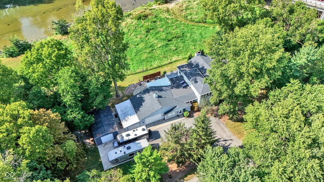Discover an unparalleled living experience on this magnificent 2-acre riverfront property located in the heart of Fishers with no HOA! Home is adjacent to 77-acre Nonie Werbe Krauss Preserve, with direct access to 2 mile nature path for walking and wildlife viewing opportunities. As you enter the home, you'll be captivated by stunning original exposed wood beams in living room and cozy wood stove for adjacent formal dining room. Family room boasts beautiful cathedral ceiling and wood-burning fireplace. The spacious kitchen flows seamlessly into the breakfast room and a nearby sunroom, flooded with natural light. A few steps down, you'll find a large office space (currently used as a salon) and a dedicated exercise room, providing flexibility to suit your lifestyle needs. Primary suite upstairs is the perfect getaway with soaking tub, tile shower, double sinks, and walk-in closet. Outdoor spaces are perfect for entertaining with an elevated deck and enormous patio with pergola overlooking peaceful river view with mature trees. Recent updates include newer roof (2022), HVAC (2022), Water Softener (2022), Water Heater (2022). Home has oversized attached 3 car garage AND a fourth garage space in a detached garage perfect for storage or a workshop. Desirable HSE schools. Quick access to I-69, Fishers Yard District, Conner Prairie, and all Fishers and North Indy have to offer! Don't miss this rare opportunity to own a distinctive riverfront sanctuary in Fishers!