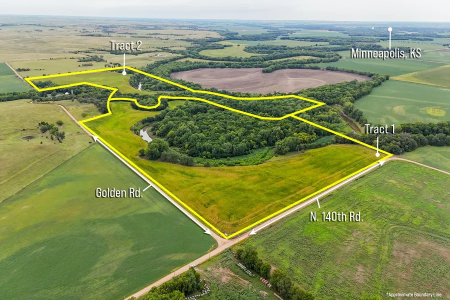 Tract 1 (57+/- acres) and Tract 2 (59+/- acres) are located at the corner of Golden Rd and N 140th Rd, offering the flexibility to purchase individually or as a combined unit for a larger, contiguous landholding.