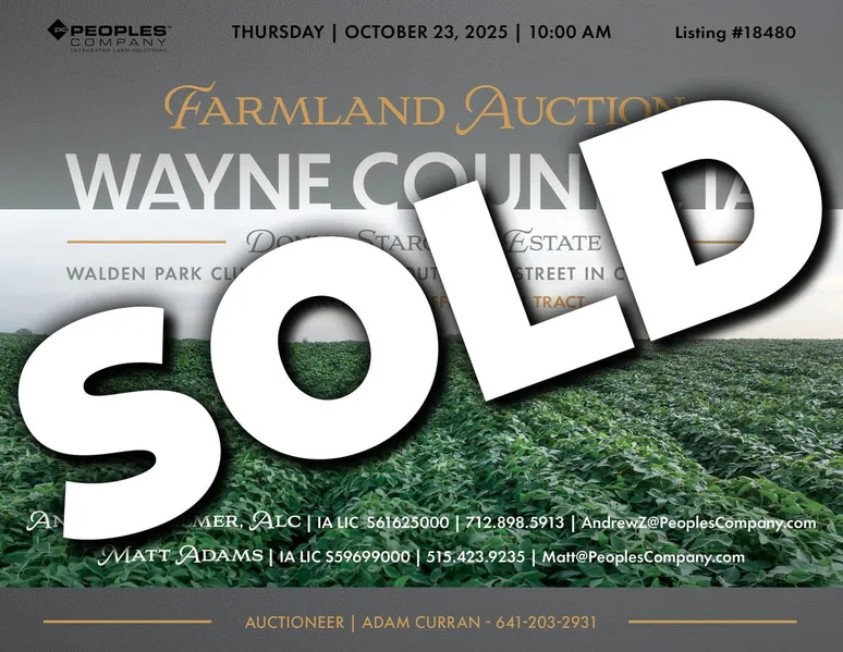 Wayne County, Iowa Land Auction - Mark your calendar for Thursday, October 23rd, 2025, at 10:00 AM! Peoples Company is pleased to be representing the Donna Starcevic Estate in the sale of 116.36 acres m/l located one mile south of Allerton, Iowa. This high-quality Wayne County, Iowa farm consists of 108.83 FSA cropland acres of Highly Erodible Land with a CSR2 soil rating of 53.6. Primary soil types include Seymour silty loam and Clarinda silty clay loam. The farm lease for 2025 has been terminated, and the farming rights are available for the 2026 crop season.