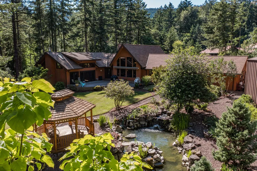 Beautifully well-maintained single story home on 2.44 ac lot in desirable area NW of Corvallis, beautiful country setting yet close to town. Nestled in the foothills of McDonald forest with a seasonal creek and easy access to hiking trails. This home boasts 3626 sf with acacia wood floors throughout, 2 master suites, large vaulted ceilings, great room, large laundry room and office. Property features park-like landscaping with waterfall water feature, large patio/deck, gazebo and multiple outbuildings!